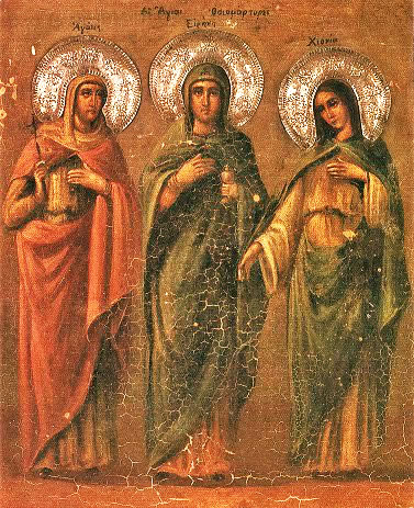 Ὡς αὐτάδελφοι Κόραι καί οὐρανόφρονες, πρός εὐσεβείας ἀγῶνας ὁμονοοῦσαι καλῶς, τόν ἀρχέκακον ἐχθρόν κατεπαλαίσατε, Χιονία ἡ σεμνή, σύν Ἀγάπῃ τῇ κλυτῇ, Εἰρήνη ἡ πανολβία. Καί νῦν Χριστόν δυσωπεῖτε, ἐλεηθῆναι τάς ψυχάς ἡμῶν.