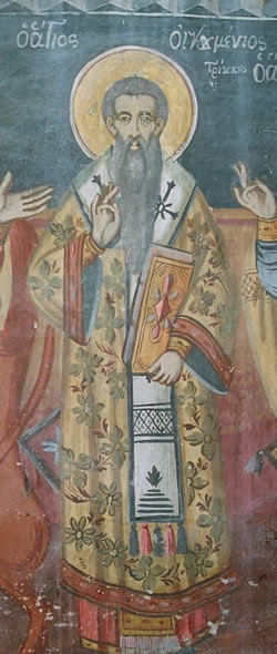 Ὁ Ἅγιος Οἰκουμένιος ἔζησε περί τά τέλη τοῦ 10ου αἰῶνος μ.Χ. καί ἦταν Ἐπίσκοπος Τρίκκης. Διακρίθηκε γιά τήν ἁγιότητα τοῦ βίου του, τήν φιλανθρωπία του καί συνέγραψε ὑπομνήματα στίς Πράξεις, στίς Ἐπιστολές τοῦ Ἀποστόλου Παύλου καί τίς Καθολικές Ἐπιστολές. Κοιμήθηκε μέ εἰρήνη καί ἐνταφιάσθηκε στό ναό τῶν Ἀρχαγγέλων στά Τρίκαλα.