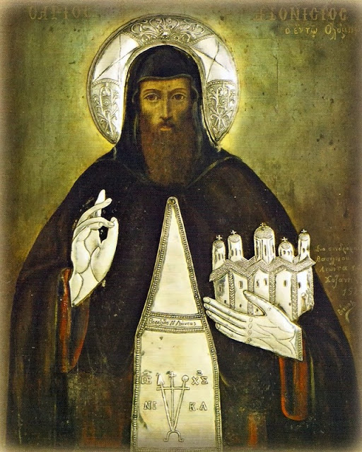 Τοῦ Ὀλύμπου οἰκήτωρ Πιερίας ἀγλάϊσμα, καί τῆς ἐπωνύμου Μονῆς σου ἱερόν περιτείχισμα, ἐδείχθης Διονύσιε σοφέ, βιώσας ὥσπερ Ἄγγελος ἐν γῇ, καί παρέχεις τήν σήν χάριν τοῖς εὐλαβῶς, προστρέχουσι τῇ σκέπῃ σου. Δόξα τῷ δεδωκότι σοι ἰσχύν, δόξα τῷ σέ στεφανώσαντι, δόξα τῷ ἐνεργοῦντι διά σοῦ πᾶσιν ἰάματα.